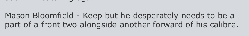 Beveree master, your quote come from the Farnborough forum. To my way of thinking the earlier comment about Bloomfield and Clifton was they might work better alongside a forward playing off them. As I understand the quotation is that Bloomfield did not have close support.